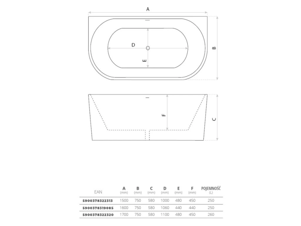 | Falra szerelhető | 5900378322320 | 1700x750x580 | Fényes fehér | Akril | 260l |