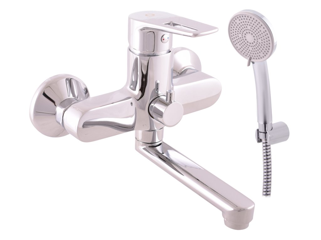 Fali kádcsaptelep lapos forgókarral, zuhanyzóval és fix tartóval.