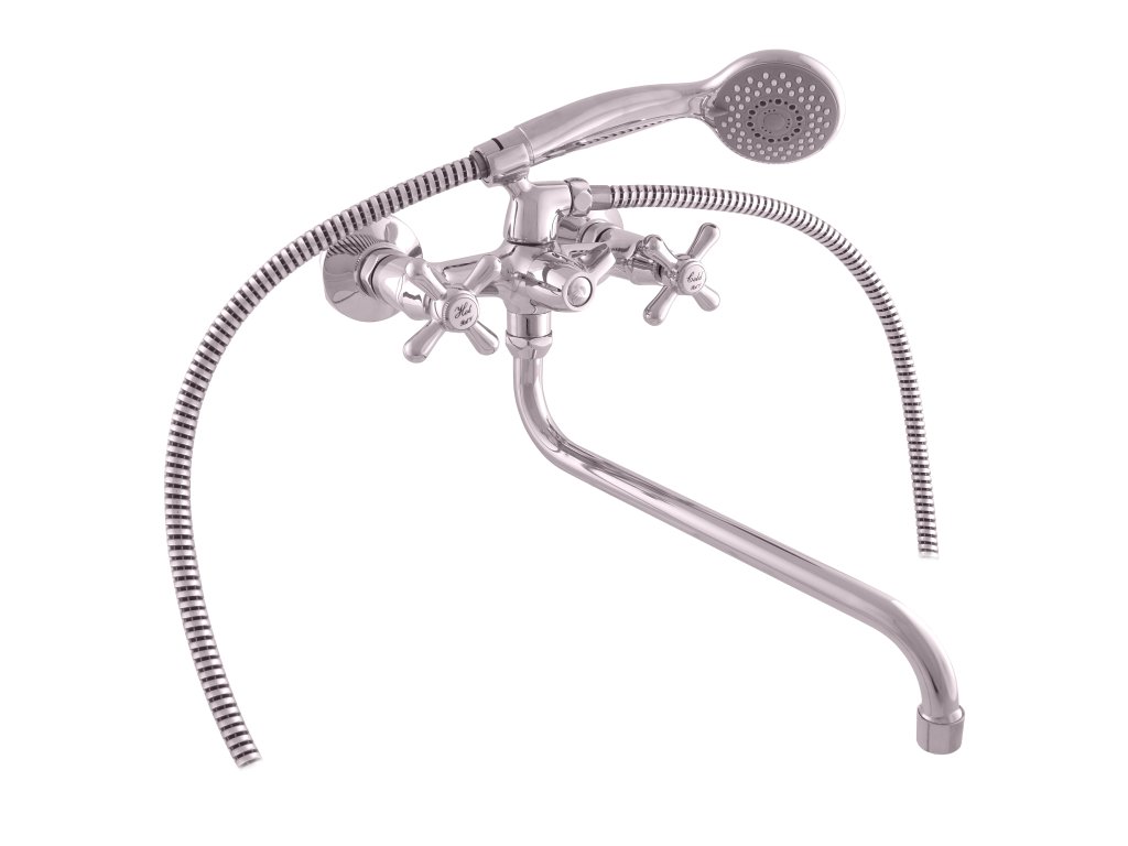 Fali kád- és mosdócsaptelep kerámia váltóval, kerek karral, zuhanyzóval és zuhanypolccal.