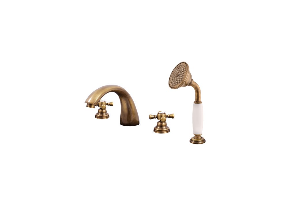 Négylyukú, álló kádcsaptelep, kifolyócsőben lévő váltóval, önbeálló zuhanyfejjel és 2 m-es gégecsővel.
