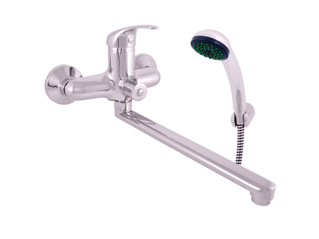 Fali kád- és mosdócsaptelep lapos, forgókaros, zuhanyzós és fix tartókonzollal.