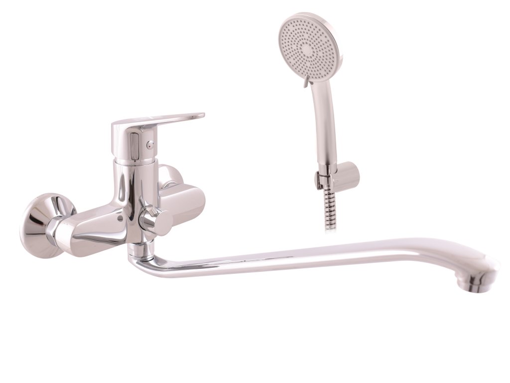 Fali kád- és mosdócsaptelep lapos, forgó "S" karral, zuhanyzóval és fix tartóval.