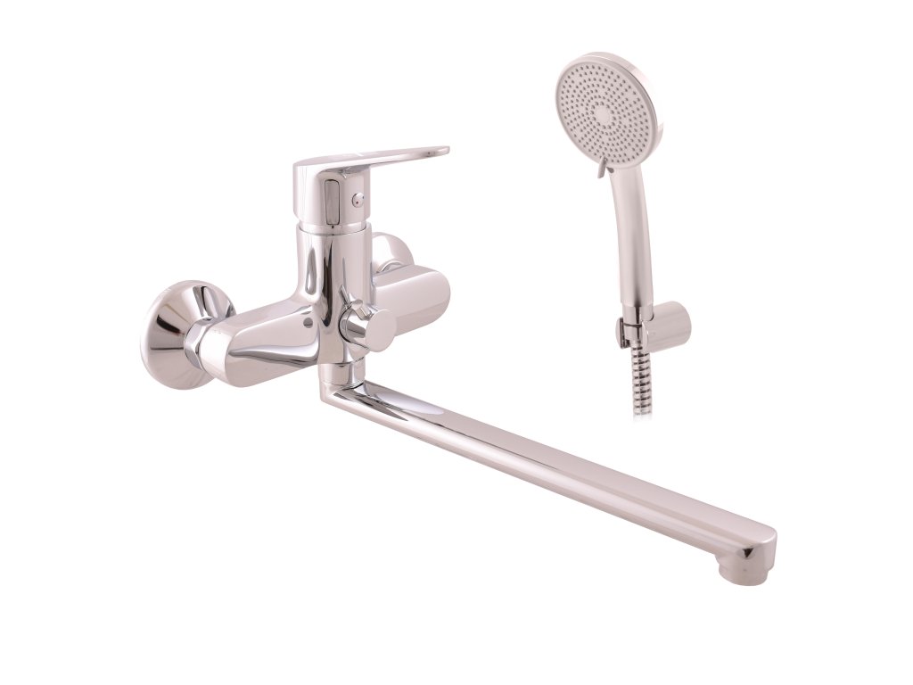 Fali kád- és mosdócsaptelep lapos, forgókarral, zuhanyzóval és fix konzollal.